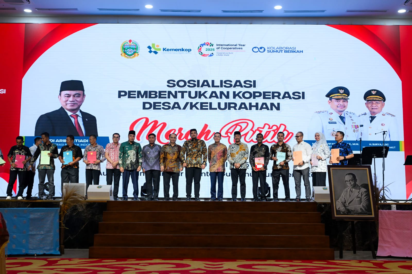 Teks foto : Menkop RI Budi, Gubsu Bobby diabadikan bersama para Kepala Daerah, Kepala Desa/Lurah se-Sumut pada acara sosialisasi Koperasi Merah Putih.
