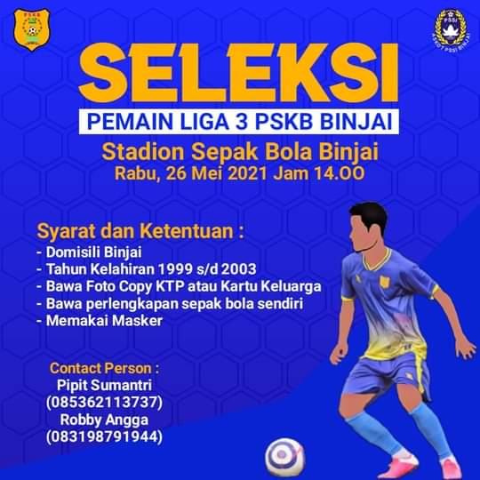 "Untuk seleksinya yaitu pada hari Rabu dan Sabtu di Stadion Binjai. Kepada adik adik kita yang ingin mencoba, silahkan datang ke lokasi mulai Pukul 14.00 Wib. InsyaAllah Ketua PSKB juga langsung ikut memantau," beber Azuan, seraya berharap dan meminta doa kepada masyarakat Binjai, agar dalam seleksi ini mendapatkan pemain muda yang berbakat.