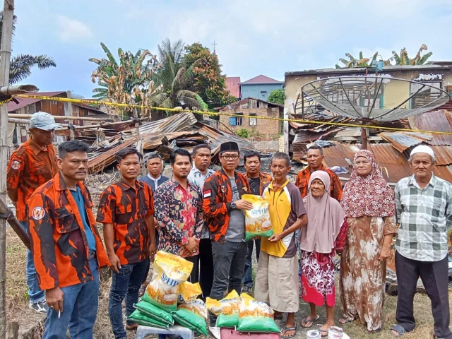 Pengurus Pimpinan Anak Cabang (PAC) Pemuda Pancasila (PP) Kecamatan Rantau Utara bergandengan tangan dengan PT Siringo-Ringo menyerahkan bantuan berupa paket sembako kepada warga yang tertimpa musibah kebakaran di jalan Sei Tawar Kelurahan Binaraga Kecamatan Rantau Utara Kabupaten Labuhanbatu, pada Jum'at (16/2/2024) sekira pukul 14.30 Wib.