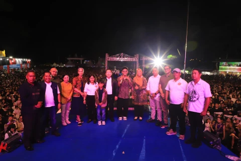 Wali Kota Pematangsiantar Wesly Silalahi SH MKn didampingi Ketua TP PKK Ny Liswati Wesly Silalahi bersama Unsur Forkopimda, perwakilan kepala daerah, serta ribuan masyarakat menghadiri acara puncak konser memeringati Hari Jadi ke-155 Kota Pematangsiantar tahun 2026, di Lapangan Adam Malik, Sabtu (25/04/2026) malam.