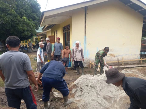 Babinsa Ramil 06/MB Membantu Pengecoran Tambahan Ruang Kelas Belajar Sekolah MIN IV