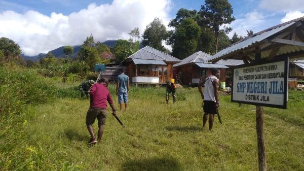 Bersama Masyarakat, Babinsa Koramil Jila Karya Bakti Bersihkan Lingkungan Sekolah