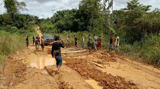 Personel Satgas Yonif 144/JY Gotong Royong Perbaiki Jalan Desa