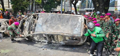 Prajurit TNI & Masyarakat Gotong Royong Bersihkan Sisa Aksi Massa dan Evakuasi Kendaraan Terbakar